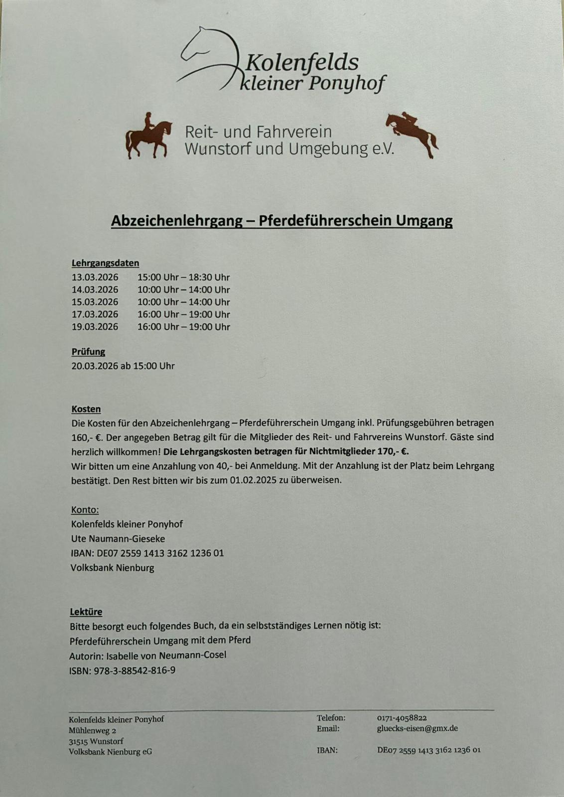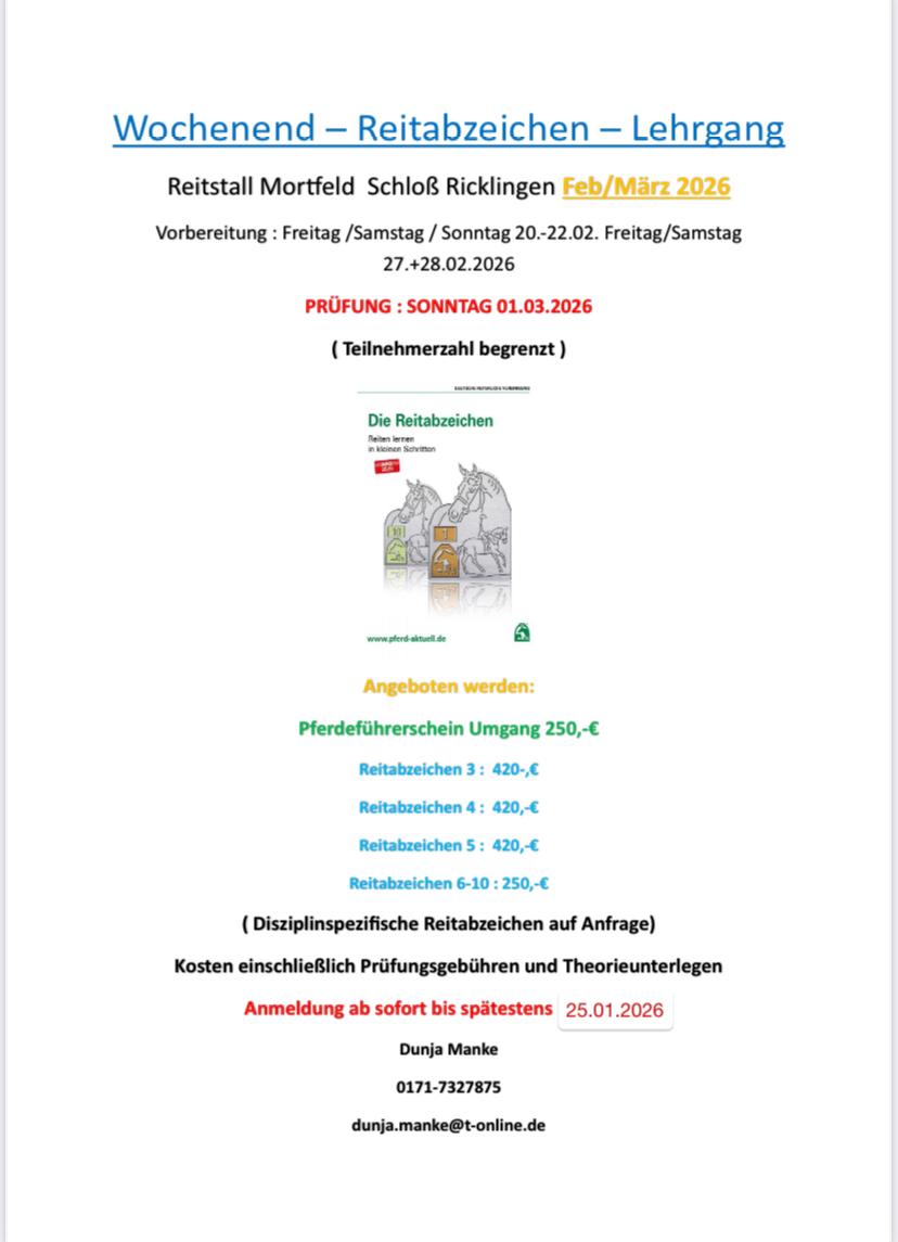 Es werden auf der Reitanlage Mortfeld Abzeichenlehrgänge angeboten. Der RFV Wunstorf wird für die teilnehmenden Mitglieder unseres Vereins die Gebühren für die Lehrgänge bezuschussen. Dafür lasst uns bitte nach bestandenem Lehrgang eine Kopie der Urkunde und einen Nachweis der Kosten des Lehrgangs zukommen.