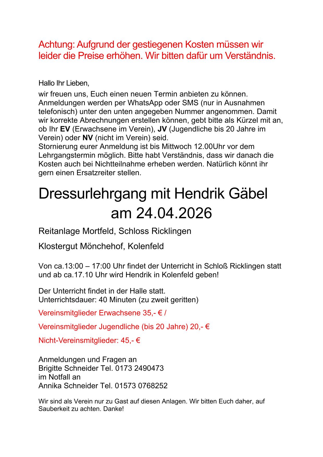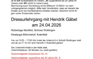 Es wird ein Dressurlehrgang mit Hendrik Gäbel am 24.04.2026 angeboten. Infos dazu gibt es auf der Homepage und unter Downloads. Allen die mit dabei sind vorab schon mal viel Spaß!